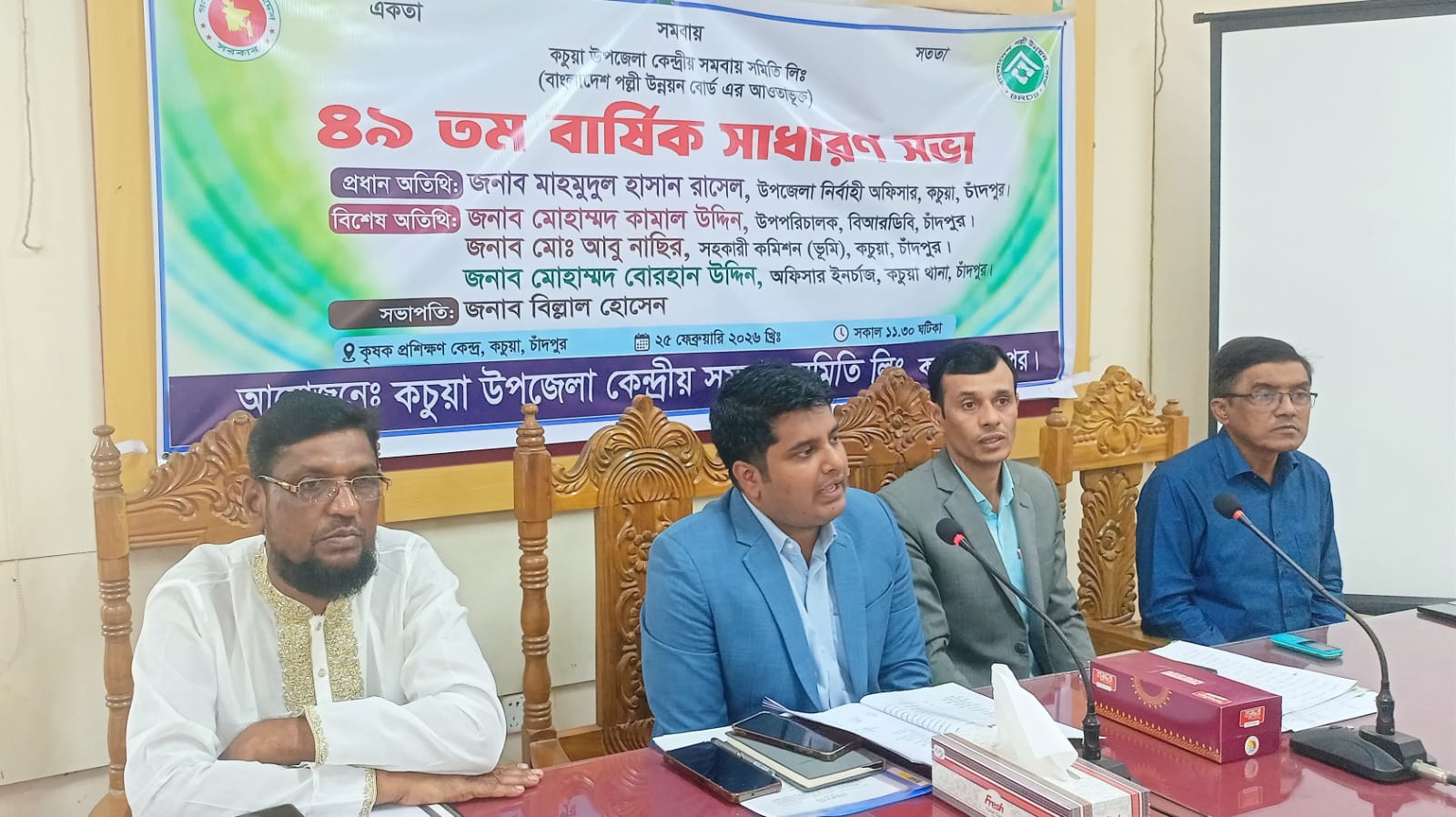 কচুয়া কেন্দ্রীয় সমবায় সমিতির ৪৯তম বার্ষিক সাধারণ সভা অনুষ্ঠিত হয়েছে। বুধবার (২৫ ফেব্রুয়ারি ২০২৬) অনুষ্ঠানে প্রধান অতিথির বক্তব্য রাখেন উপজেলা নির্বাহী অফিসার মাহমুদুল হাসান রাসেল।