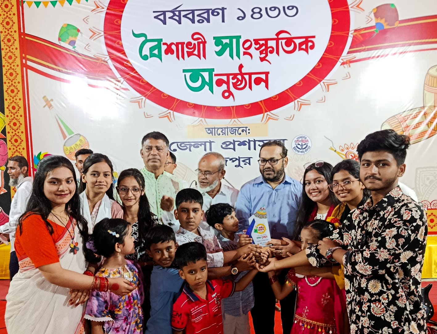 বুধবার (১৫ এপ্রিল ২০২৬) ১৪৩৩ বাংলা নববর্ষের বৈশাখী সাংস্কৃতিক অনুষ্ঠানে প্রধান অতিথি জেলা প্রশাসক আহমেদ জিয়াউর রহমান হাত থেকে জেলা প্রশাসনের বৈশাখী শোভাযাত্রায় অংশগ্রহণ করে প্রথম বিজয়ীর ক্রেস্ট গ্রহণ করছেন বীর মুক্তিযোদ্ধা মোহন বাঁশি স্মৃতি সংসদের প্রতিষ্ঠাতা সভাপতি ও অধ্যক্ষ অজিত দত্ত সহ সংগঠনের খুদে চিত্রশিল্পীরা।