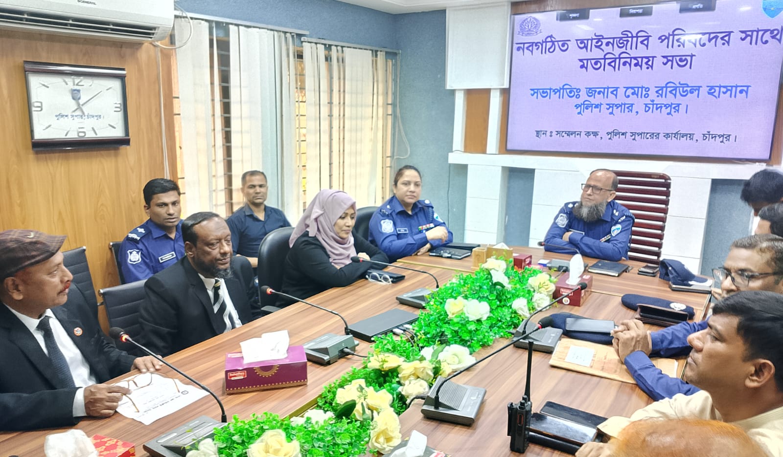 নবনির্বাচিত চাঁদপুর জেলা আইনজীবী সমিতির নেতৃবৃন্দের সাথে পুলিশ সুপারের মতবিনিময় সভা অনুষ্ঠিত হয়েছে। এ সময় আইনজীবী সমিতির পক্ষ থেকে পুলিশ সুপারকে ফুলেল শুভেচ্ছা জানানো হয়।