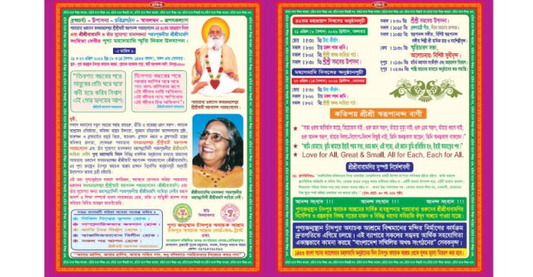 ব্যাপক আয়োজনের মধ্য দিয়ে সুমহান চরিত্র গঠন আন্দোলনের স্রষ্টা, অভিক্ষা মন্ত্রের উদ্গাতা, স্বাবলম্বন ও ব্রহ্মাচর্যের প্রমূর্ত বিগ্রহ, পরমারাধ্য গুরুদেব অখণ্ড মণ্ডলেশ্বর শ্রীশ্রী স্বামী স্বরূপানন্দ পরমহংসদেব ও তাঁর সুযোগ্যা মানসকন্যা পরম পূজনীয়া শ্রীশ্রী মা মনি সংহিতা দেবীর পুণ্য মহাসমাধি দিবস অনুষ্ঠিত হবে চাঁদপুর অযাচক আশ্রমে। এ উপলক্ষে সোমবার (২৭ এপ্রিল ২০২৬) চাঁদপুর অযাচক আশ্রমে ভোর সাড়ে ৫ টায় ঊষা কীর্ত্তন, সকাল ৮টায় মঙ্গল শঙ্খধ্বনি, শ্রীশ্রী অখণ্ড সংহিতা পাঠ, সকাল সাড়ে ৮টায় সমবেত উপাসনা শেষে ব্রহ্মগায়েত্রী গীত, নীরব মহানাম জপ যজ্ঞ, সকাল পৌনে ১১টায় বিশিষ্ট কণ্ঠশিল্পী মানিক রায় ও সহশিল্পীদের পরিচালনায় স্বরূপানন্দ সংগীত। সকাল সাড়ে ১১টায় শ্রী শ্রী বাবা মনি স্বামী স্বরূপানন্দ পরমহংসদেব ও তারই সুযোগ্যা মানসকন্যা সংহিতা দেবী স্মরণে অনুষ্ঠিত হবে স্মৃতিচারণ সভা, দুপুর দেড়টায় হরি ওঁ মহানাম সংকীর্ত্তন ও মহাপ্রসাদ বিতরণ শেষে দুপুর আড়াইটায় শান্তি বাচনের মাধ্যমে দিনব্যাপী অনুষ্ঠানের শুভ সমাপ্তি।