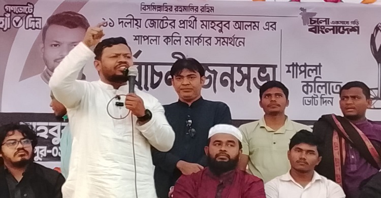 আসন্ন জাতীয় সংসদ নির্বাচনে লক্ষ্মীপুর-১ (রামগঞ্জ) আসনের ১১ দলীয় জোট এনসিপির শাপলাকলি প্রতীকের প্রার্থী মো. মাহবুব আলম বলেছেন, বিএনপি দেশটাকে দুর্নীতি, সন্ত্রাস ও মাদকের স্বর্গরাজ্যে পরিণত করতে চাচ্ছে। তারা দুর্নীতি ও লুটতরাজ চালাবার জন্যে মাফিয়াদেরকে নমিনেশন দিয়েছে। ২০২৪-এর গণঅভ্যুত্থানের পর আমরা চিন্তা করেছিলাম, ঐক্যবদ্ধ হয়ে আমাদের প্রিয় বাংলাদেশকে সন্ত্রাসমুক্ত করবো, চাঁদাবাজমুক্ত করবো, দুর্নীতিমুক্ত করবো এবং ন্যায় ও ইনসাফের একটি বাংলাদেশ গড়বো। কিন্তু আমরা দেখেছি, ফ্যাসিবাদ চলে যাওয়ার পরও ওদের আদর্শে লালিত হয়ে বিএনপি দেশটাকে দুর্নীতির স্বর্গরাজ্যে পরিণত করার চেষ্টা করছে। সুতরাং আগামী ১২ তারিখে দুর্নীতিবাজদেরকে রায় না দিয়ে আমাদেরকে রায় দিতে হবে। দেশের পক্ষে যারা রাজনীতি করেন, দেশের জনসাধারণের প্রতি যাদের বিশ্বাস আছে, দেশের জনসাধারণের সমস্যা সমাধান করে জনগণের জানমালের উন্নয়নের জন্যে যারা কাজ করেন সেই জামায়াতে ইসলামীর নেতৃত্বে এনসিপির নেতৃত্বে ১১ দলীয় জোটকে ভোট দিতে হবে। তিনি বলেন, আগামীতে দেশটাকে আধিপত্যবাদ, বিদেশি শক্তির ব্যাকগ্রাউন্ড হিসেবে তৈরি করবো কিনা? নাকি আমরা দেশপ্রেমিক শক্তির কাছে দেশটাকে হস্তান্তর করবো তার সিদ্ধান্ত আগামী ১২ তারিখে আপনাদেরকেই নিতে হবে। তিনি শনিবার (৭ ফেব্রুয়ারি ২০২৬) বিকেলে ভাদুর ইউনিয়নের ভাদুর হাই স্কুল মাঠে এনসিপি কর্তৃক আয়োজিত নির্বাচনী জনসভা ও রাত ৯ টায় রামগঞ্জ বাজার ব্যবসায়ীদের সাথে শহরস্থ মোহাম্মদিয়া হোটেল এন্ড চাইনিজ রেস্টুরেন্টে মতবিনিময় সভায় প্রধান অতিথির বক্তব্যে এসব কথা বলেন। তিনি ব্যবসায়ীদেরকে উদ্দেশ্য করে বলেন, আমি যদি নির্বাচিত হই তাহলে আপনাদেরকে চাঁদাবাজমুক্ত রামগঞ্জ উপহার দেবো। এ সময় আরও বক্তব্য রাখেন ২০২৪-এর অভ্যুত্থানের সম্মুখ সারির যোদ্ধা বাংলাদেশ জাতীয় ছাত্র ছাত্রশক্তির সাধারণ সম্পাদক আবু বাকের মজুমদার, যুগ্ম সাধারণ সম্পাদক খান তালাত মাহমুদ রাফি, রামগঞ্জ উপজেলা জামেয়াতে ইসলামীর আমির নাজমুল হাসান পাটোয়ারী, রামগঞ্জ পৌরসভা আমির মো. হাসান বান্না প্রমুখ নেতৃবৃন্দ।