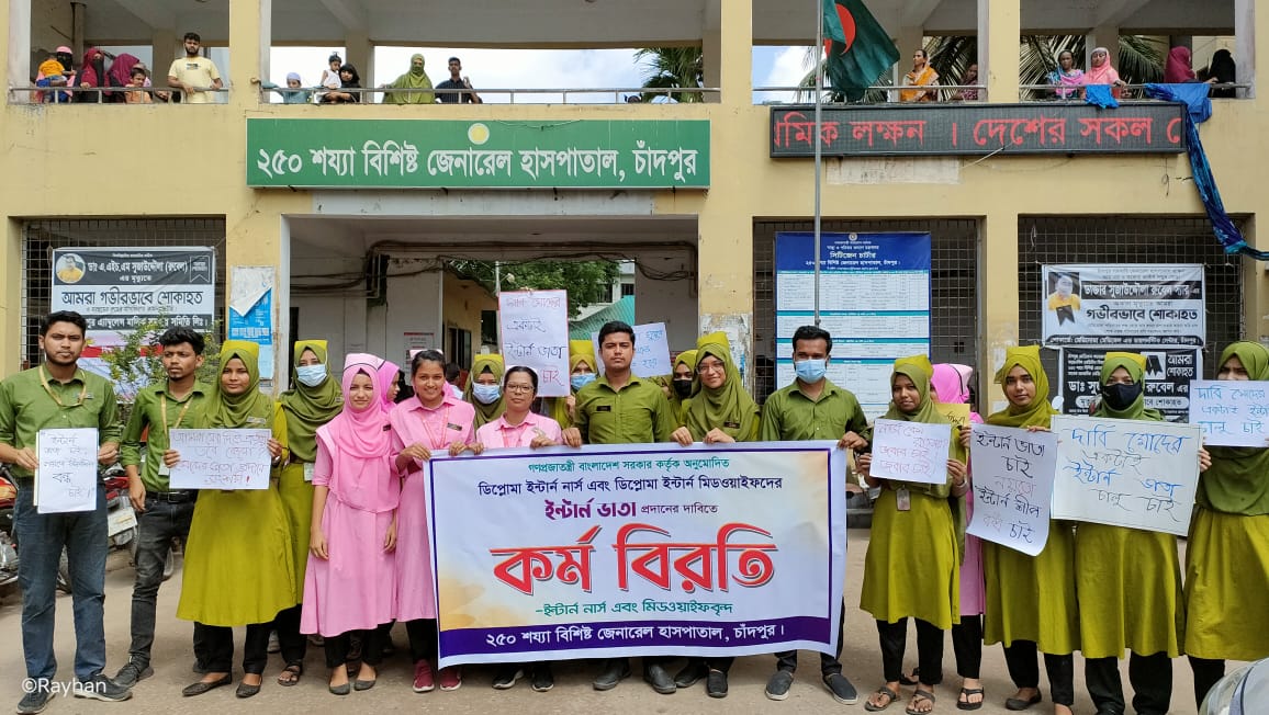 চাঁদপুরে ইন্টার্ন নার্স ও ইন্টার্ন মিডওয়াইফ ভাতার দাবীতে কর্মবিরতি ও মানববন্ধন