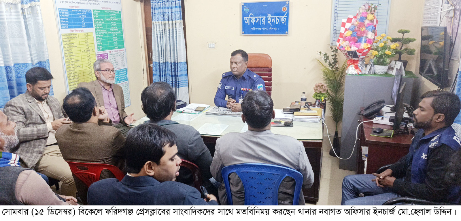 সোমবার (১৫ ডিসেম্বর ২০২৫) বিকেলে থানার ভারপ্রাপ্ত কর্মকর্তার কার্যালয়ে ফরিদগঞ্জ প্রেসক্লাবের সাংবাদিকদের সাথে মতবিনিময় সভায় এ কথা বলেন নবাগত ওসি মো. হেলাল উদ্দিন।