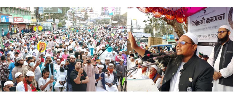 'এসো জনপ্রত্যাশার বাংলাদেশ গড়ি' এই প্রতিপাদ্যকে সামনে রেখে ইসলামী আন্দোলন বাংলাদেশ-এর প্রার্থীর নির্বাচনী জনসভায় সভাপতি হিসেবে তিনি এসব কথা বলেন।এ সময় তিনি আরো বলেন, এখনো দেখছি ভোটের জন্যে অনেক নেতারা বড়ো বড়ো অফার আমাদের সামনে তুলে ধরছে। এ রকম অফার আমরা বিগত দিনেও দেখেছি। ১০ টাকা কেজিতে চাল খাওয়াবে বলে ৭০ টাকা করে খেতে হয়েছে। তাই বলছি, অফার গ্রহণ করার আগে কিন্তু আমাদের শর্ত বুঝে নিতে হবে। আমাদের কাছে কালো টাকা নেই, আমাদের কাছে পেশী শক্তি নেই, আমাদের কাছে দুর্নীতির চাঁদাবাজির টাকা নেই, আমরা মানুষকে টাকা দিয়ে ভোট কিনতে পারবো না, আমরা মানুষের অন্তর জয় করে দেশকে জয় করতে চাই। আপনাদের দোয়ার বরকতে মানুষের দ্বারে দ্বারে যাওয়ার সৌভাগ্য হয়েছে। মানুষ আর বিগত দিনের রাজনীতি দেখতে চায় না। মানুষ এখন নতুন রাজনৈতিক বন্দোবস্ত চায়। আমরা মানুষ, আমরা মানবতার কাণ্ডারী, আমরা মানুষের সেবা করতে চাই। কোনো এমপি মন্ত্রী হওয়া আমাদের মুখ্য উদ্দেশ্য নয়। যেহেতু এটা একটি বিশাল সেবার জায়গা, তাই চাঁদপুর-৩ আসনে আল্লাহ যদি আমাকে কবুল করেন, তাহলে আপনাদের সেবা করতে চাই। ইনশাআল্লাহ আল্লাহতা'লা যদি আমাদেরকে কবুল করে আমরা ওলামাসহ মসজিদের ইমামদের সাথে নিয়ে মানুষের সেবার কাজে নিয়োজিত হবো। আসছে ভোট, এই ভোট পবিত্র আমানত, ভোট হলো সাক্ষী, ভোট হলো সমর্থন করা, আপনার এই পবিত্র আমানত নিয়ে কোনো ব্যক্তি যদি সংসদ সদস্য হয়, প্রতিনিধি হয়ে সে সেখানে গিয়ে যদি জনগণের হক নষ্ট করে, রাষ্ট্রের সম্পদ চুরি করে, আপনাদের মাথাপিছু বরাদ্দ যদি চুরি করে, তখন সে কিন্তু একাই অপরাধী নয় বরং যারা ভোট দিয়েছে তারাও সমান অপরাধী। সময় হয়েছে আপনাদের বিবেককে জাগ্রত করার। আপনারা যদি প্রত্যেক প্রাপ্তির সাথে কম্পেয়ার করে যদি ভাল মনে করেন, তাহলে এ দেশের সকলের মার্কা এবার হাতপাখা। চাঁদপুরবাসীর খাদেম হিসেবে যেন আল্লাহতালা আমাকে কবুল করে--আমি আপনাদের কাছে এই দোয়া চাই। আমি চাঁদপুর সদর ও হাইমচরের সকল উন্নয়নে সকলকে নিয়ে কাজ করতে চাই।
