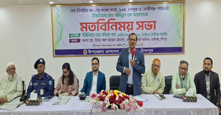 হাজীগঞ্জ উপজেলা প্রশাসনের আয়োজনে মতবিনিময় সভায় প্রধান অতিথির বক্তব্য রাখছেন চাঁদপুর-৫ (হাজীগঞ্জ-শাহরাস্তি) আসনের নবনির্বাচিত সংসদ সদস্য মো. মমিনুল হক এমপি। ছবি : কামরুজ্জামান টুটুল।