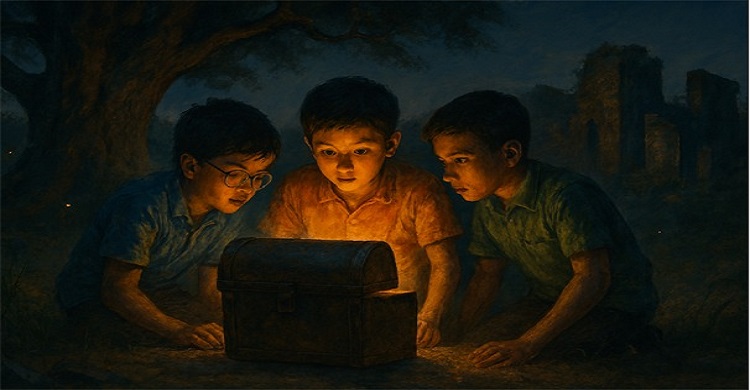 হঠাৎ তারা দেখলো, একটি পুরনো কবরের পাশে মাটির নিচে কিছু জ্বলজ্বল করছে। খুঁড়ে বের করতেই তারা পেলো একটি ছোট্ট কাঠের বাক্স। ভেতরে ছিলো কিছু পুরনো বই, গ্রামের ইতিহাস, আর একটি চিঠি।