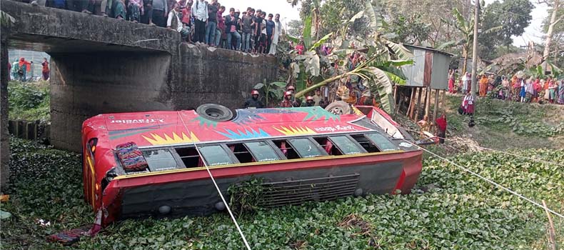 মতলবে সড়ক দুর্ঘটনায় যাত্রীবাহী বাস খালে, আহত ১৭