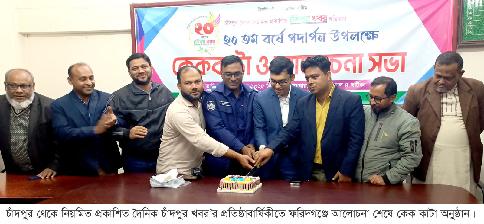 ফরিদগঞ্জে উৎসবমুখর পরিবেশে চাঁদপুর খবর পত্রিকার ২০তম বর্ষে পদার্পণ উপলক্ষে কেক কাটা ও আলোচনা সভা অনুষ্ঠিত হয়েছে। দীর্ঘ দুই দশক ধরে সত্য, বস্তুনিষ্ঠ ও জনস্বার্থভিত্তিক সাংবাদিকতায় অবদানের স্বীকৃতি হিসেবে এ আয়োজনটি স্থানীয় সাংবাদিক ও সুধীজনদের মিলনমেলায় পরিণত হয়। বুধবার (২৪ ডিসেম্বর ২০২৫) বিকেলে ফরিদগঞ্জ প্রেসক্লাব মিলনায়তনে আয়োজিত এ অনুষ্ঠানে প্রধান অতিথি হিসেবে উপস্থিত ছিলেন উপজেলা নির্বাহী কর্মকর্তা সেটু কুমার বড়ুয়া।